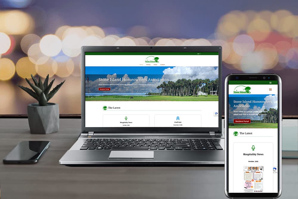The Stone Island Homeowners Association website presents a clean, community-focused digital experience tailored for residents and prospective homeowners alike. Immediately upon arrival, visitors are greeted with a welcoming headline that reinforces the unique character of the neighborhood, “a special private community where man lives in humble awe of nature”.